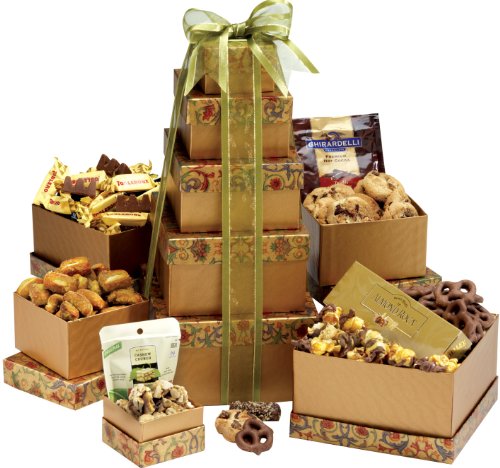 The Gift Tower Deluxe is a five-star five-box tower is filled with an array of delectable gourmet snacks and sweets. Open the decorative gift tower lids to find cashew crunch, gourmet honey mustard pretzels, chocolate chip cookies, Ghirardelli hot cocoa mix, assorted chocolates, chocolate dipped pretzels, caramel popcorn and more! This gift basket is hand arranged to maintain optimum design and tied with a bow on top.B003U7R5TYASIN