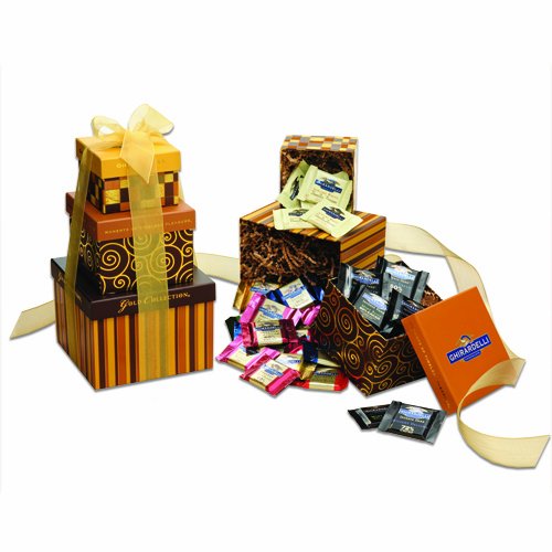 Treat the chocolate lovers in your life to true elegance with a gift you know they will love this holiday season with the Ghirardelli Gold Collection Tower of Squares. This generous offering includes the best that Ghirardelli has to offer--in a festive three-tiered tower of contrasting boxes. The handcrafted gift is ready to give and tied with a gold organza ribbon.| Ghirardelli's signature intense, slow-melting chocolate |