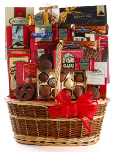 Your chocolate taste buds will thank you for this one. This grand ensemble includes all your favorites: Ghirardelli Masterpiece truffles, chocolate truffle almonds, chocolate drizzled popcorn, Ghirardelli chocolate squares and bars, chocolate pretzels, chocolate grahams, fudge, and so much more.Wine.com Chocolate Decadence Gift Basket Feature