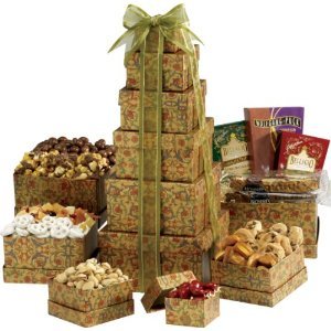 The Ultimate Gift Tower is just that - the ultimate gifting experience. Whatever the reason, whatever the season, The Ultimate Gift Tower is the perfect gift! With an abundance of gourmet foods, this six-box tower is impressive enough to send to the office. Tower includes: chocolate covered cherries, butter toffee peanuts, garlic and cheese pretzels, chocolate chip cookies, yogurt covered pretzels, chocolate peanuts, chocolate-drizzled caramel popcorn, chocolate covered nuts, hot cocoa, biscotti and more! This gift tower is hand arranged to maintain optimum design and tied with a bow on top.Broadway Basketeers The Ultimate Gourmet Gift Tower for Mother's Day Feature