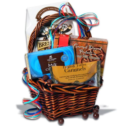 Our 'Mini' Chocolate Gift Baskets are the perfect gift for your favorite chocolate lover. If your mouth is not already watering as you look at the photo above, an ingredient list is sure to send you over the edge! Each chocolate basket contains Triple Chocolate Bliss Cookies, a Milk Chocolate Signature Bar from Lake Champlain, Gourmet Milk Chocolate Dipped Pretzels, and English Toffee Caramels. With just the right amount of gourmet chocolate snacks to indulge the senses, these rich, luxurious chocolate gifts are sure to be a hit!Mini' Chocolate Gift Basket Feature