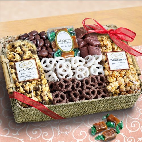 - Chocolate and caramel lovers will love this larger-sized decadent basket.